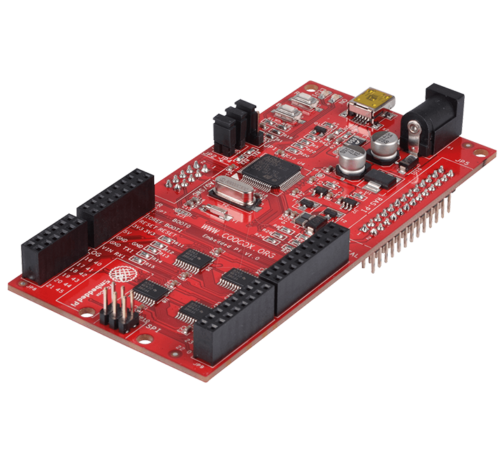 The Embedded Pi is based on the ST Micro-electronics STM32F103 MCU, and can operate as a bridge between Raspberry Pi and Arduino shields and in standalone mode as a Cortex-M3 evaluation board.