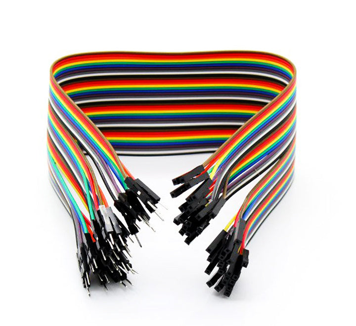 Handy for making wire harnesses or jumpering between headers on PCB's. These premium jumper wires are 6" (150mm) long and come in a 'strip' of 40 (4 pieces of each of ten rainbow colors). They have 0.1" male header contacts on one end and 0.1" female header contacts on the other. They fit cleanly next to each other on standard-pitch 0.1" (2.54mm) header. The best part is they come in a 40-pin ribbon cable. You can always pull the ribbon wires off to make individual jumpers, or keep them together to make neatly organized wire harnesses.