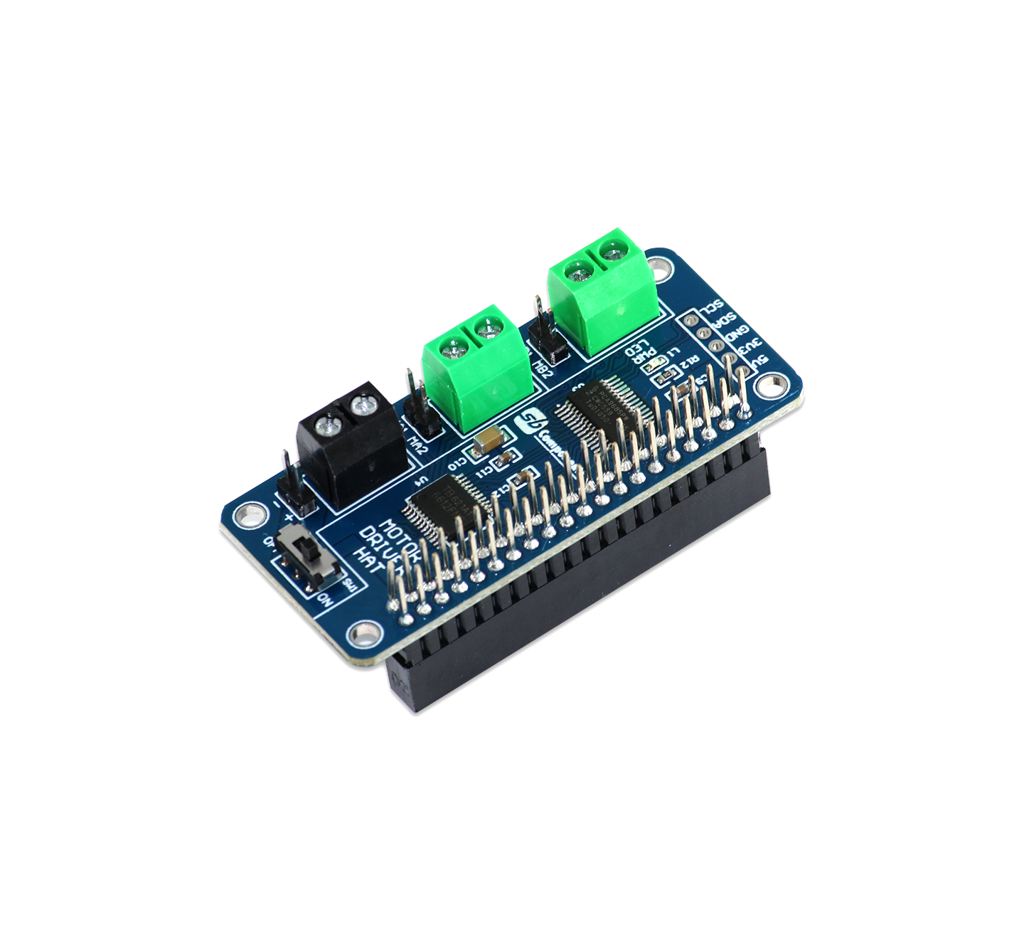 Motor Driver HAT is a module designed to control 2 DC motors simultaneously with I2C communication. It has a powerful onboard chip PCA9685 which provides 12-bit hardware PWM to adjust the motor speed. The logic voltage is 3.3 V with the motor driver TB6612FNG. It can be powered from a battery through the VIN terminal which makes a better experience for the user.