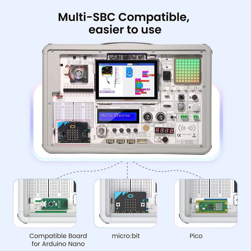 CrowPi 3 is a highly integrated development platform compatible with Raspberry Pi, micro:bit, Raspberry Pi Pico, and Nano-form-factor boards.