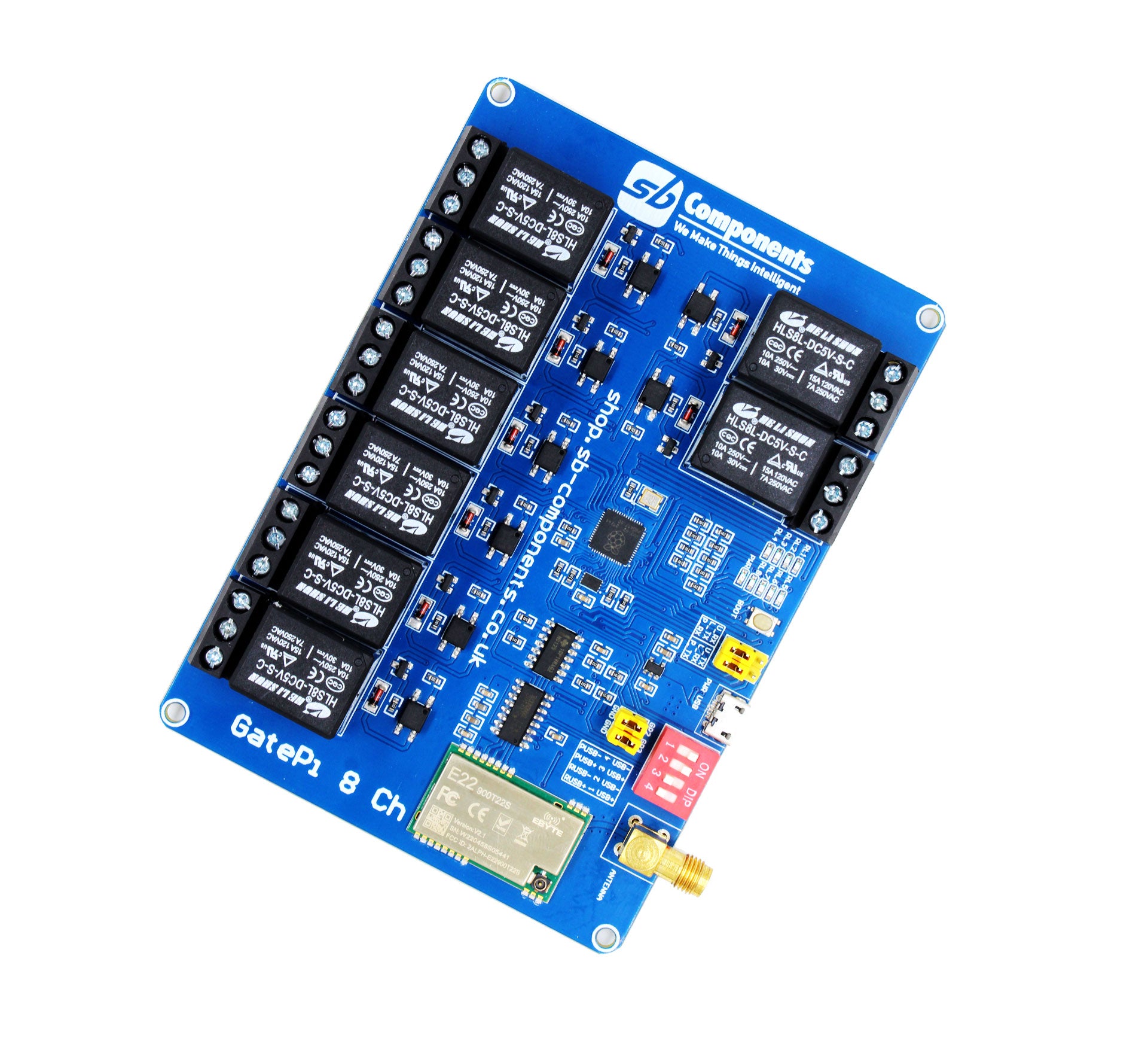 The GatePi 8 Channel Relay Board is based on LoRaTM and the RP2040 MCU. It is a low-power data transmission board with all of the same characteristics as the GatePi 4 Channel, except that it contains 8 relay channels for enhanced capacity and efficiency.