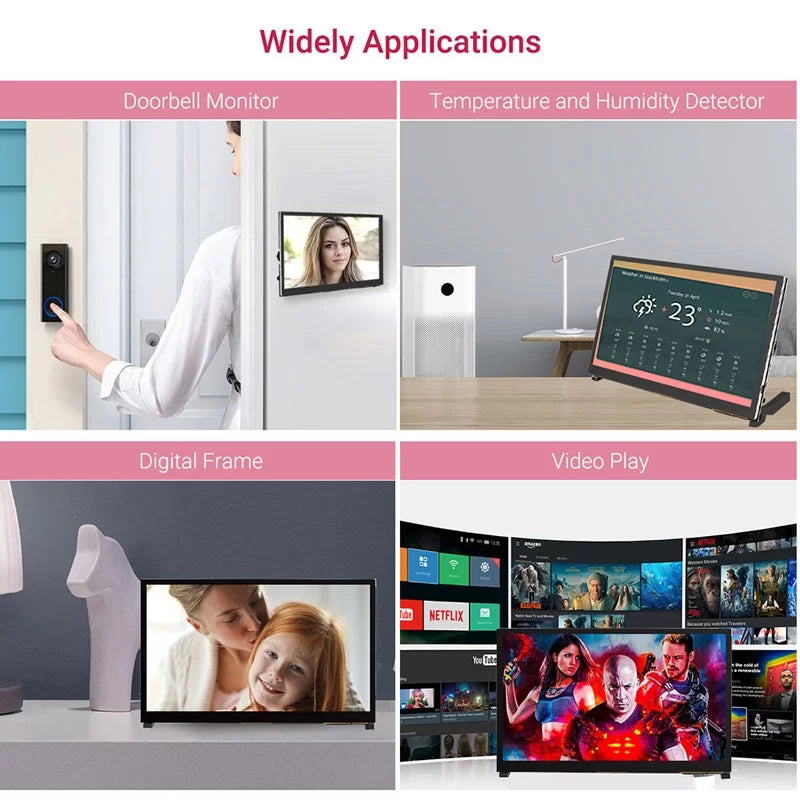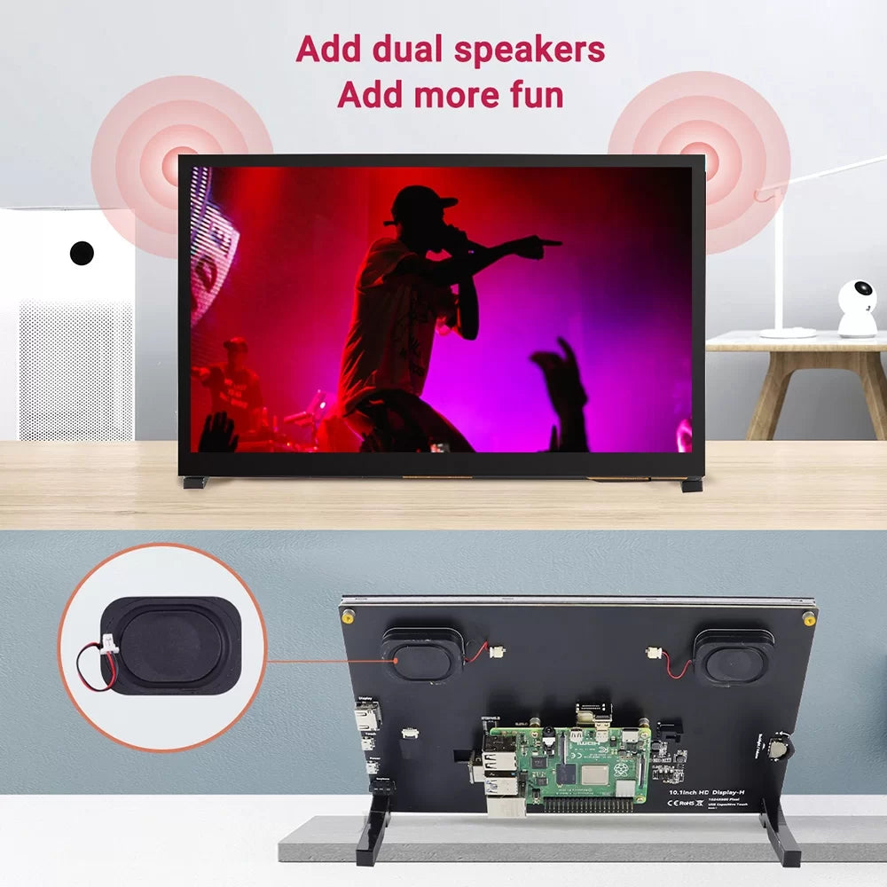 This 10.1 inch HD display with a capacitive USB touchscreen, Simply power the USB touch port to achieve touch function, and no need to install the driver, just plug and play! Especially, with dual removable speakers to enhance your audiovisual experiences. Four corner holes let you mount the small monitor onto your DIY IoT projects that you’re working on. It can be used as a computer monitor, supports the win7 / win8 / win10 system, and is touch-free.