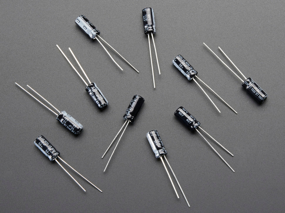 This is a 10 pack of 10uF 50V electrolytic capacitors, suitable for use with any DC voltage up to 50V. They have a tolerance of ±20% and long flexible pins ideal for perf or breadboards. Electrolytic capacitors are good for low-frequency filtering (~1KHz or less); for higher frequencies, pair them with a ceramic capacitor.