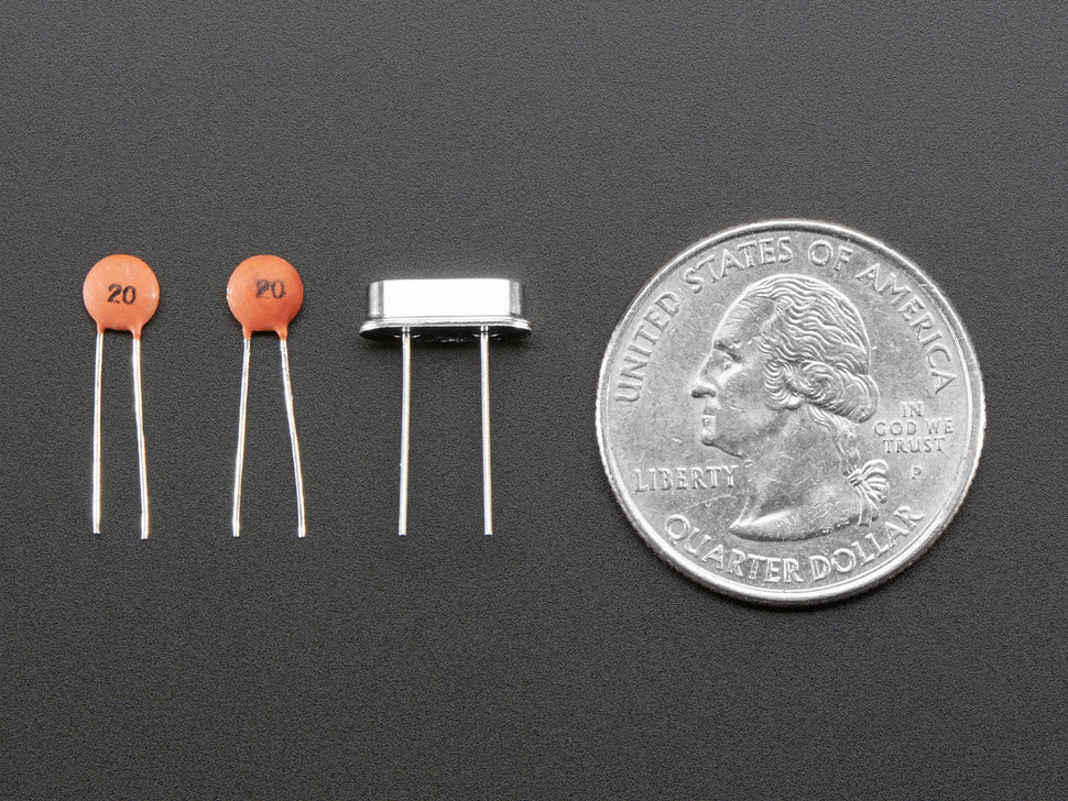 Usage: Connect the two crystal pins to XTAL-in and XTAL-out on your circuit (pins are symmetric). Connect one capacitor from each crystal pin to ground. Verify your microcontroller datasheet for any additional components like a 1 Megaohm resistor.