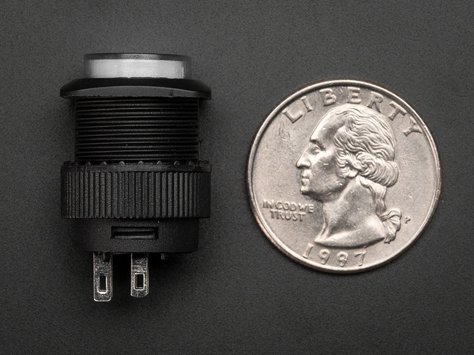 The 16mm Illuminated Pushbutton with a white body is a medium-sized, latching on/off switch with a built-in white LED. The button is large enough for easy pressing yet compact to avoid obstructing your project panel. It features separate contacts for the switch and the LED, giving you control over the LED illumination independently of the switch action.