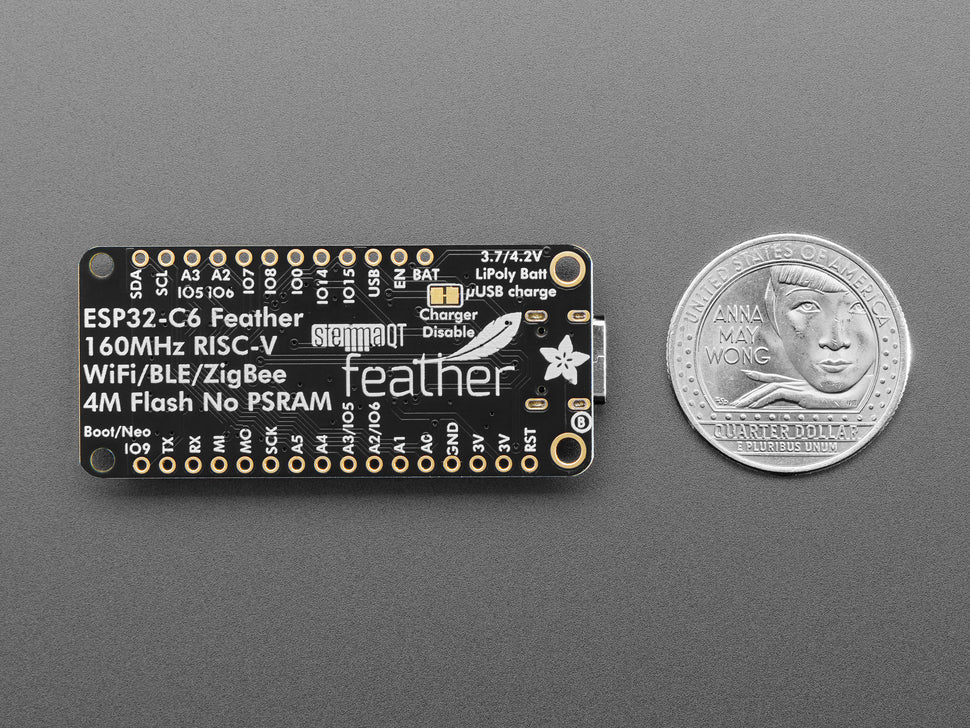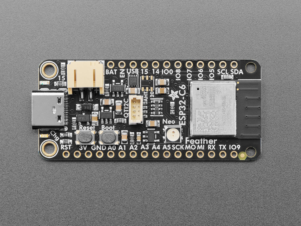 We took our Feather ESP32-S2 and swapped out the 'S2 for a C6. Plus some re-routing and here's what we've got: a C6 Feather with lots of GPIO, lipoly charging and monitoring with the MAX17048, NeoPixel, I2C Stemma QT port, and a second low-quiescent LDO for disabling the I2C and NeoPixel when we want ultra-low power usage - as low as 17uA in deep sleep.