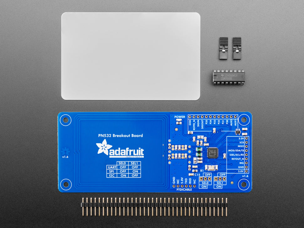 Comes with: the PN532 breakout board including a tuned 13.56MHz stripline antenna, 0.1" header, 2 jumpers/shunts and a 4050 level shifter chip. We also toss in a 13.56MHz 1K card!