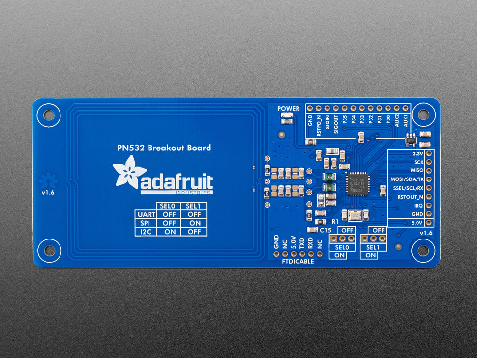 The PN532 is also very flexible, you can use 3.3V TTL UART at any baud rate, I2C or SPI to communicate with it. This chip is also strongly supported by libnfc, simply plug in an FTDI cable and use the FTDI serial port device to communicate - this lets you do NFC dev using any Linux/Mac/Windows computer! We also include onboard power LED, 3.3V regulator and an FTDI header so you can plug in an FTDI friend or FTDI cable and use with libnfc.