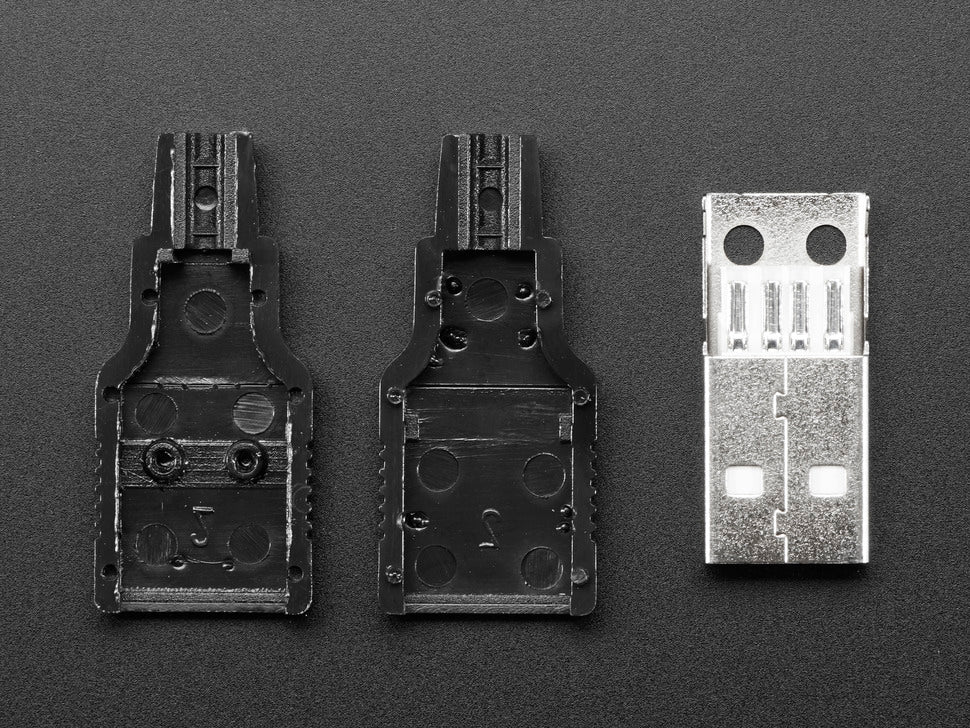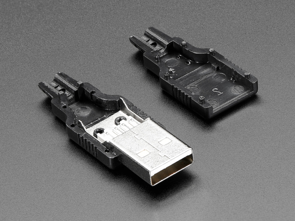 Make your own USB connections easily without soldering thin wires by using this USB DIY Connector Shell - Type A Male Plug. Each shell includes a two-part snap plastic shell and a proper USB Type A Male connector with easy-to-solder tabs, perfect for custom USB cable projects.
