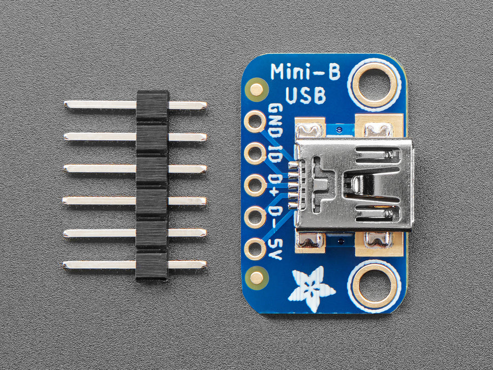 Simple but effective, this breakout board features a USB Mini-B connector with all 5 pins broken out. Perfect for pairing with microcontrollers with USB support or adding USB 5V power to your project.